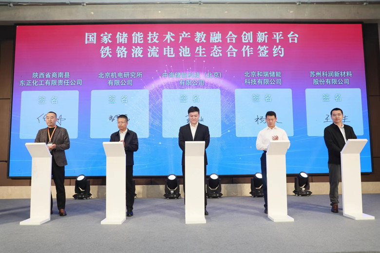 专场会上陕西省商南县东正化工有限责任公司、中海储能科技(北京)有限公司、北京和瑞储能科技有限公司、北京机电研究所有限公司和苏州科润新材料股份有限公司,五家单位联合完成了国家储能技术产教融合创新平台铁铬液流电池生态合作签约。本次签约强化了液流电池产业链上中下游企业的产业合作和有效对接,实现固链补链强链,对促进液流电池产业链供应链循环畅通、推动液流电池的高质量发展具有重要意义。